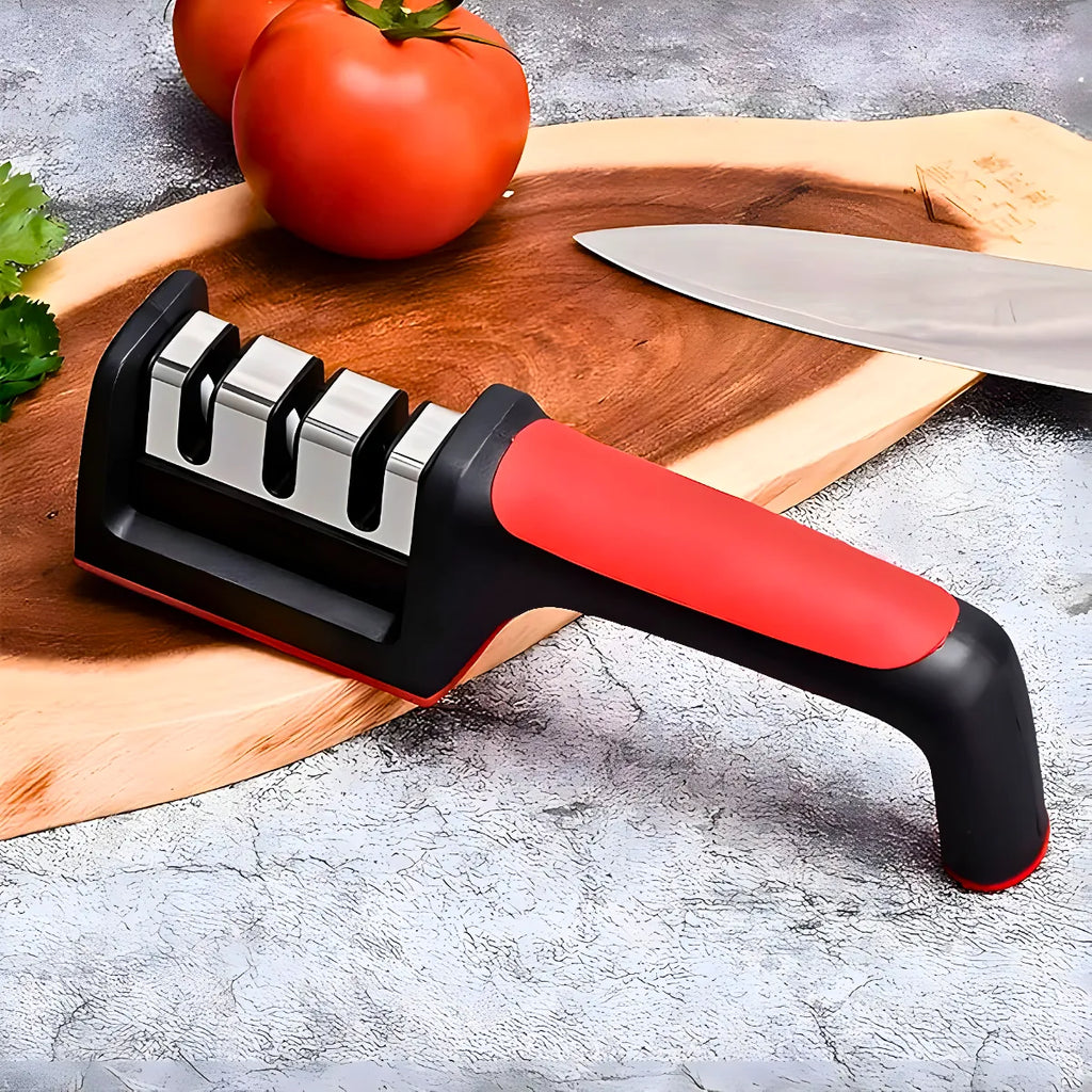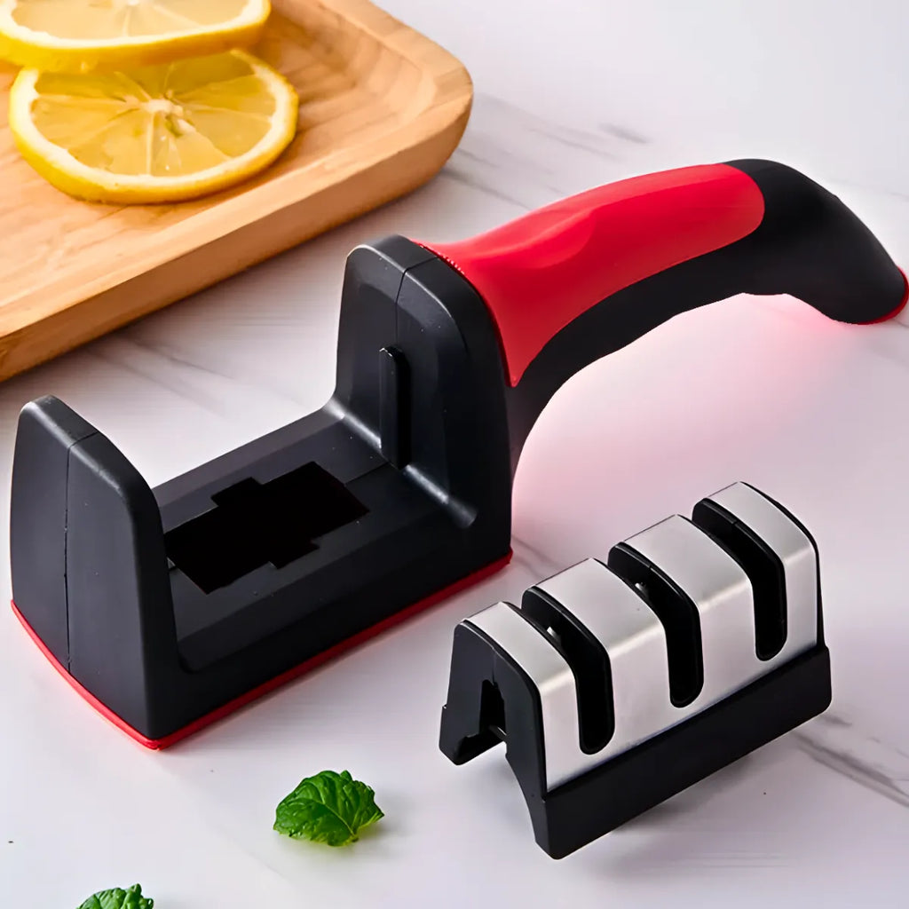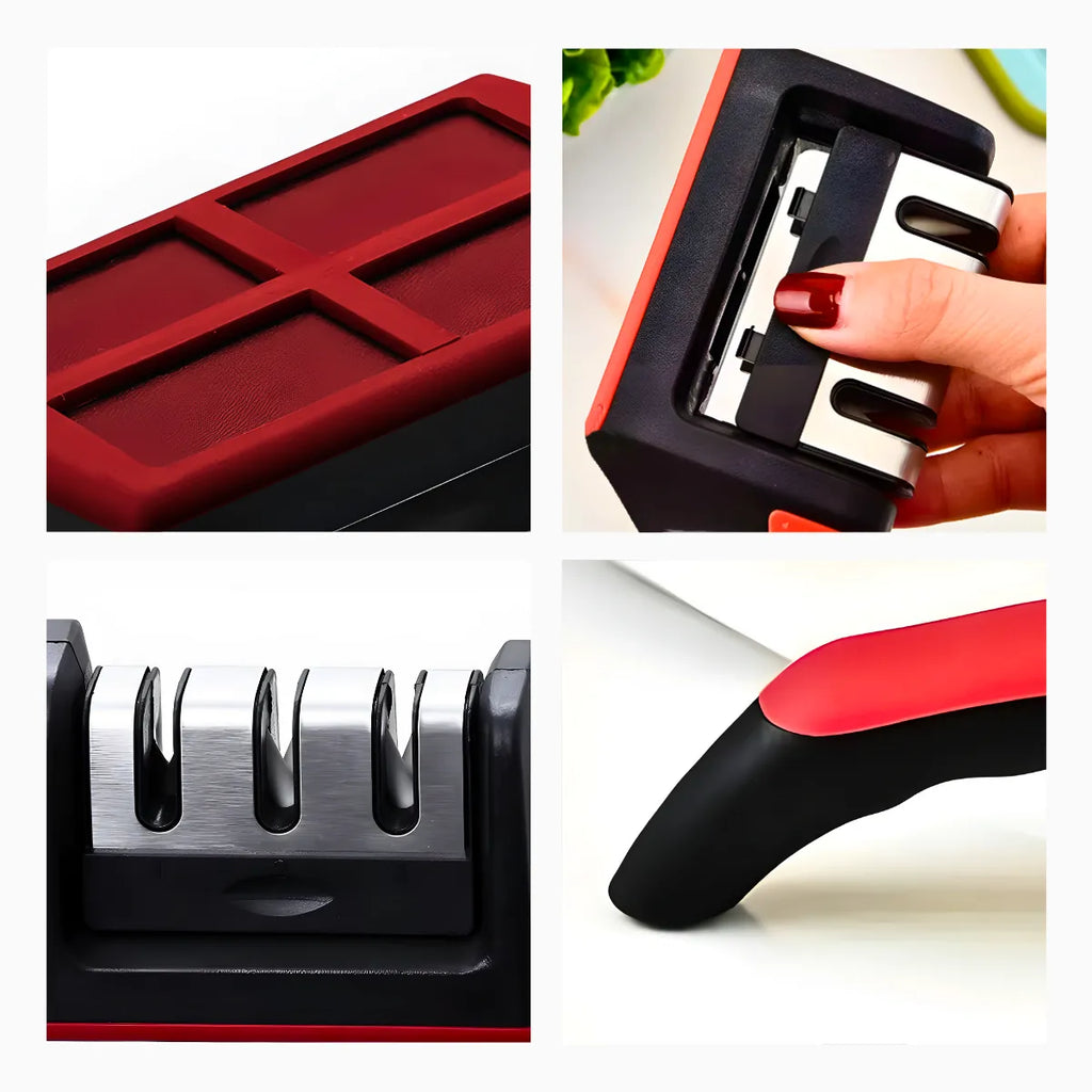 - Base de Aço Inoxidável: A base do afiador é feita de aço inoxidável de alta qualidade, garantindo durabilidade e resistência a desgastes.