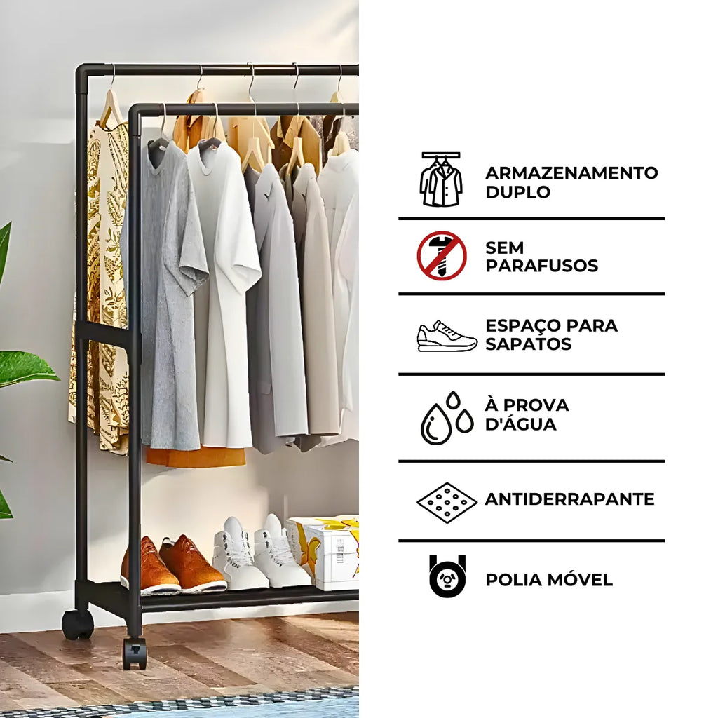 - Versatilidade de Uso: Esta arara é ideal para uso em diversos ambientes. Perfeita para quem tem pouco espaço e precisa de um local eficiente para organizar roupas, sapatos e acessórios. Também pode ser utilizada para exibição de produtos em lojas, boutiques ou para organização em lavanderias.