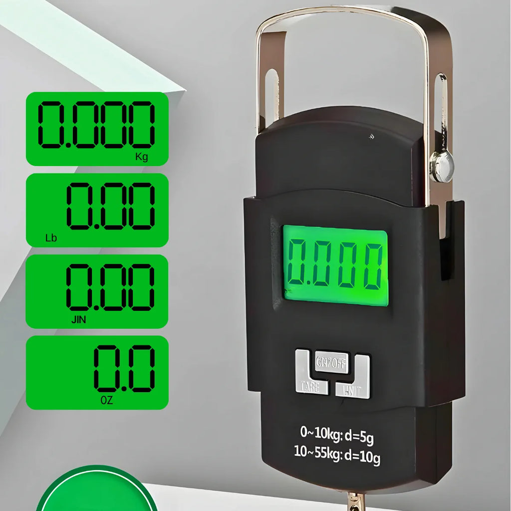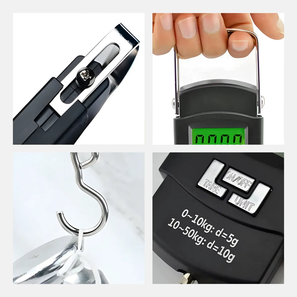 - Gancho de Metal Durável: Equipado com um gancho de metal fundido e ampliado, a balança é resistente e segura para pesagens, especialmente para itens como malas e sacolas.