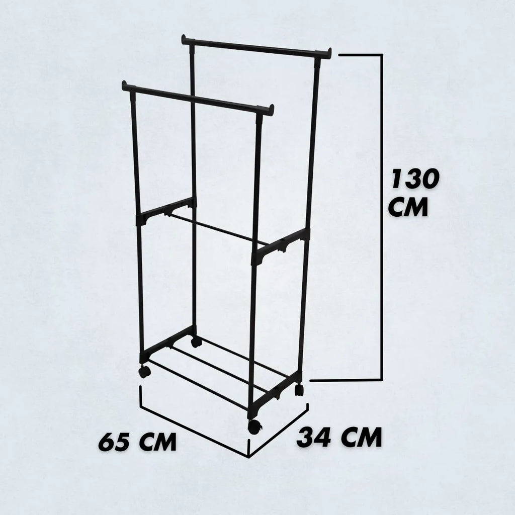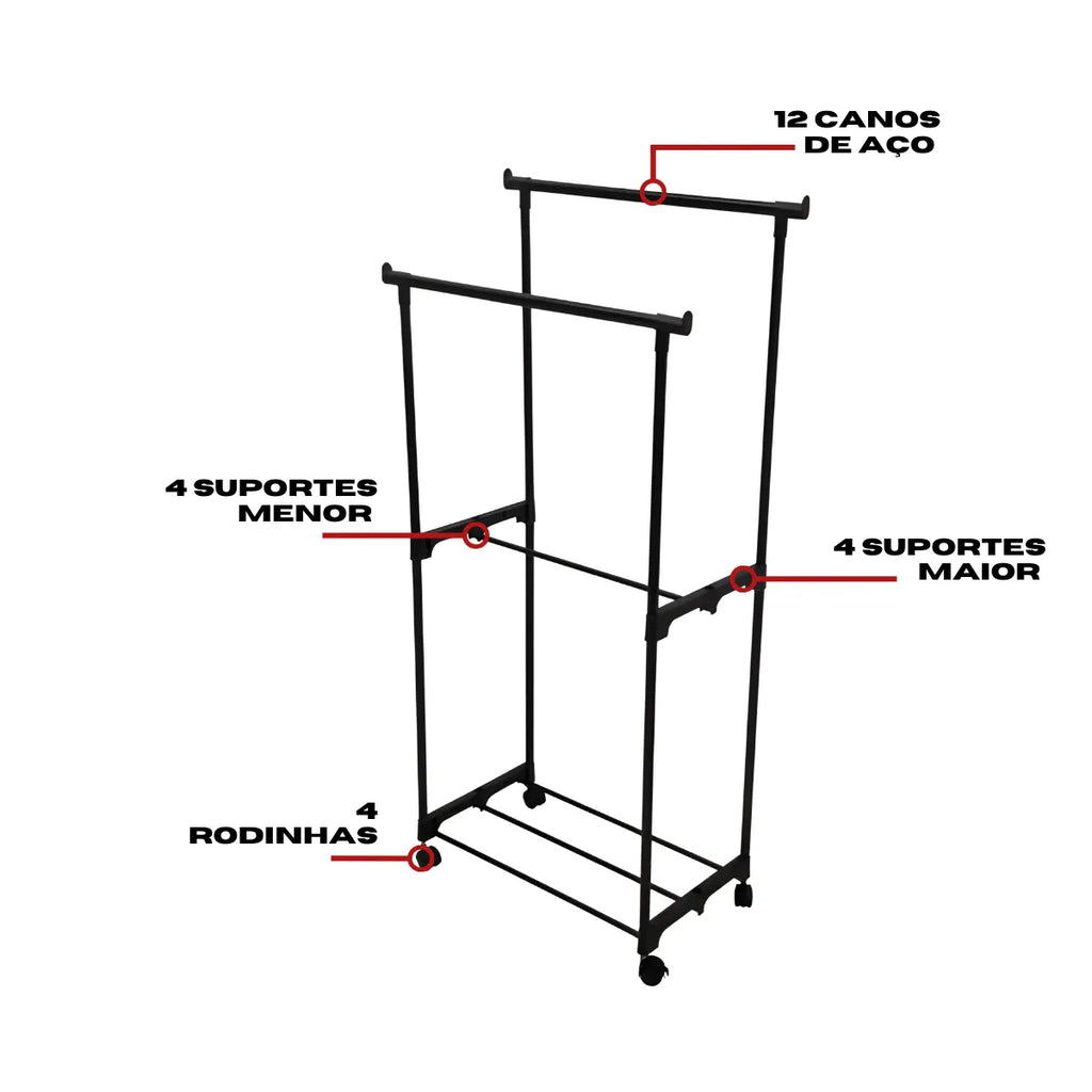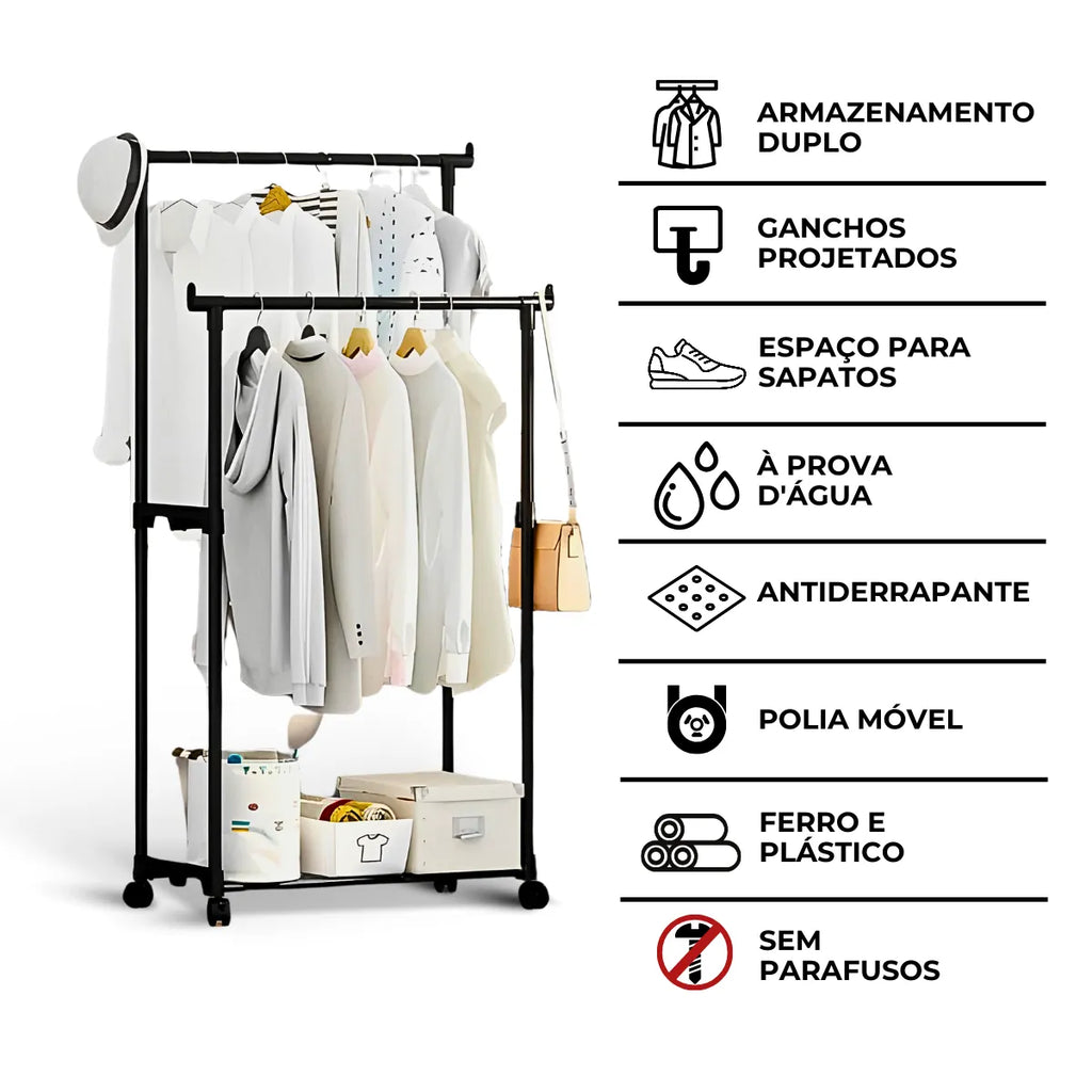 • Dupla Capacidade de Pendurar: Com duas barras para roupas, nossa Arara Dupla oferece espaço suficiente para pendurar até 5kg de peças, mantendo sua coleção organizada e acessível.