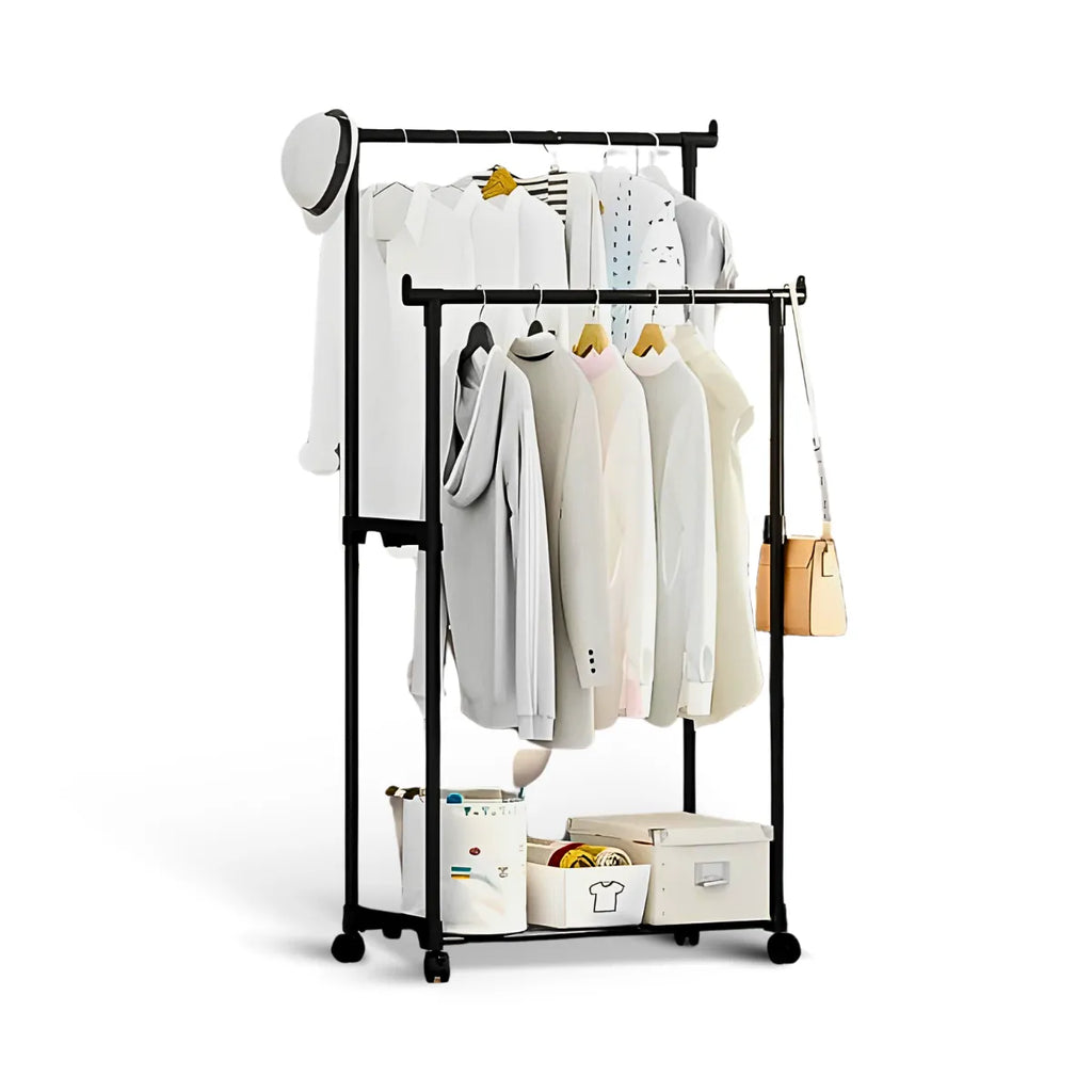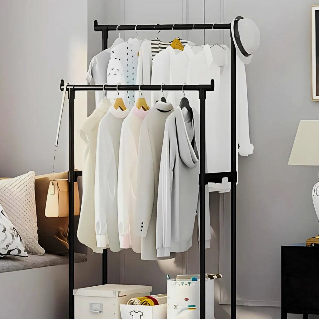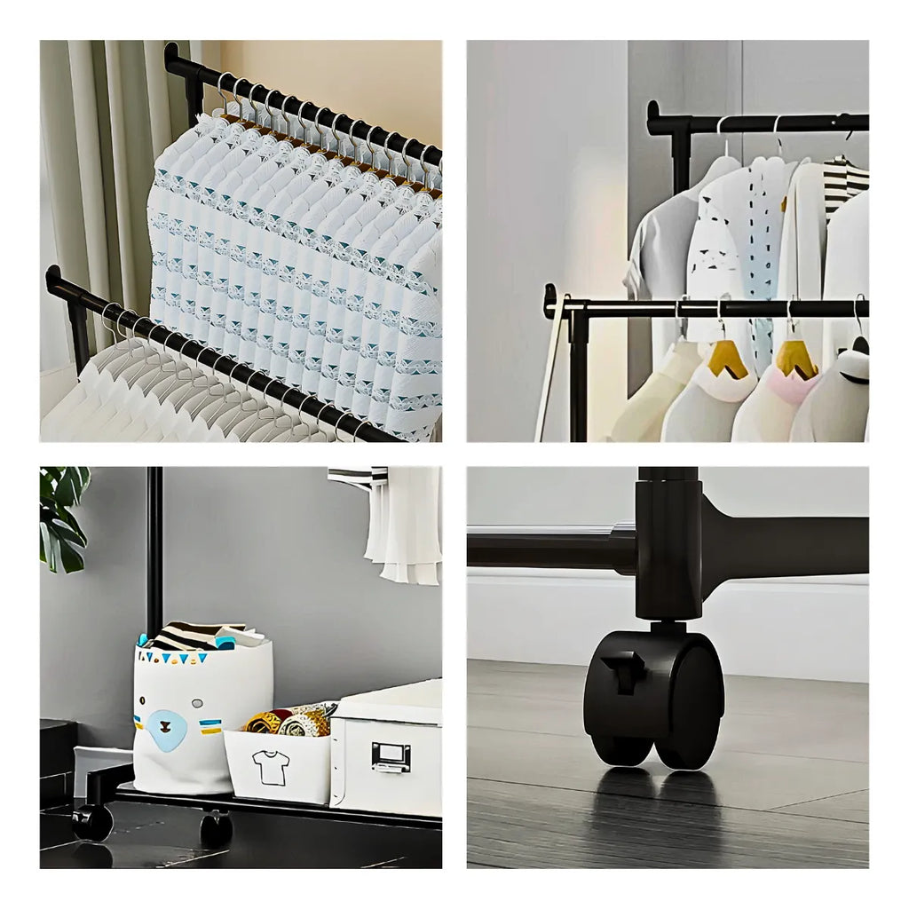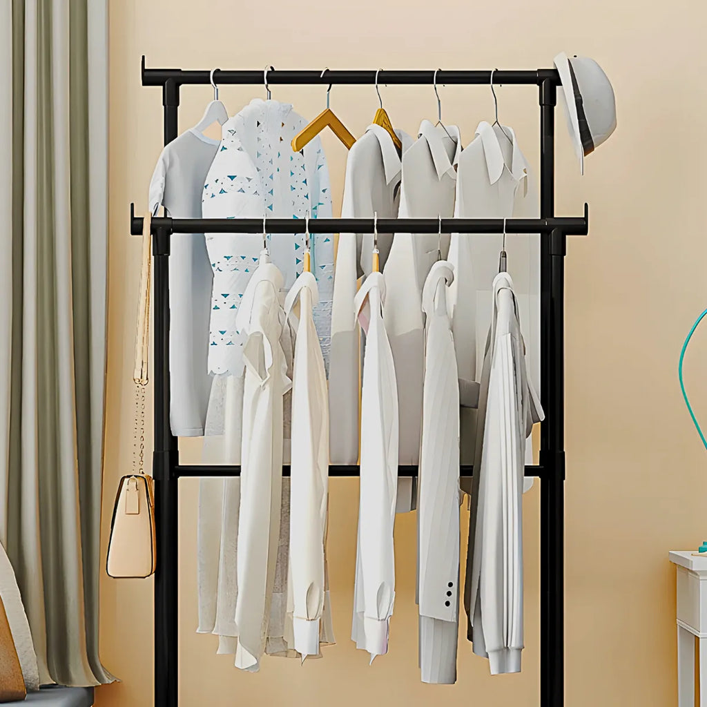 • Dupla Capacidade de Pendurar: Com duas barras para roupas, nossa Arara Dupla oferece espaço suficiente para pendurar até 5kg de peças, mantendo sua coleção organizada e acessível.