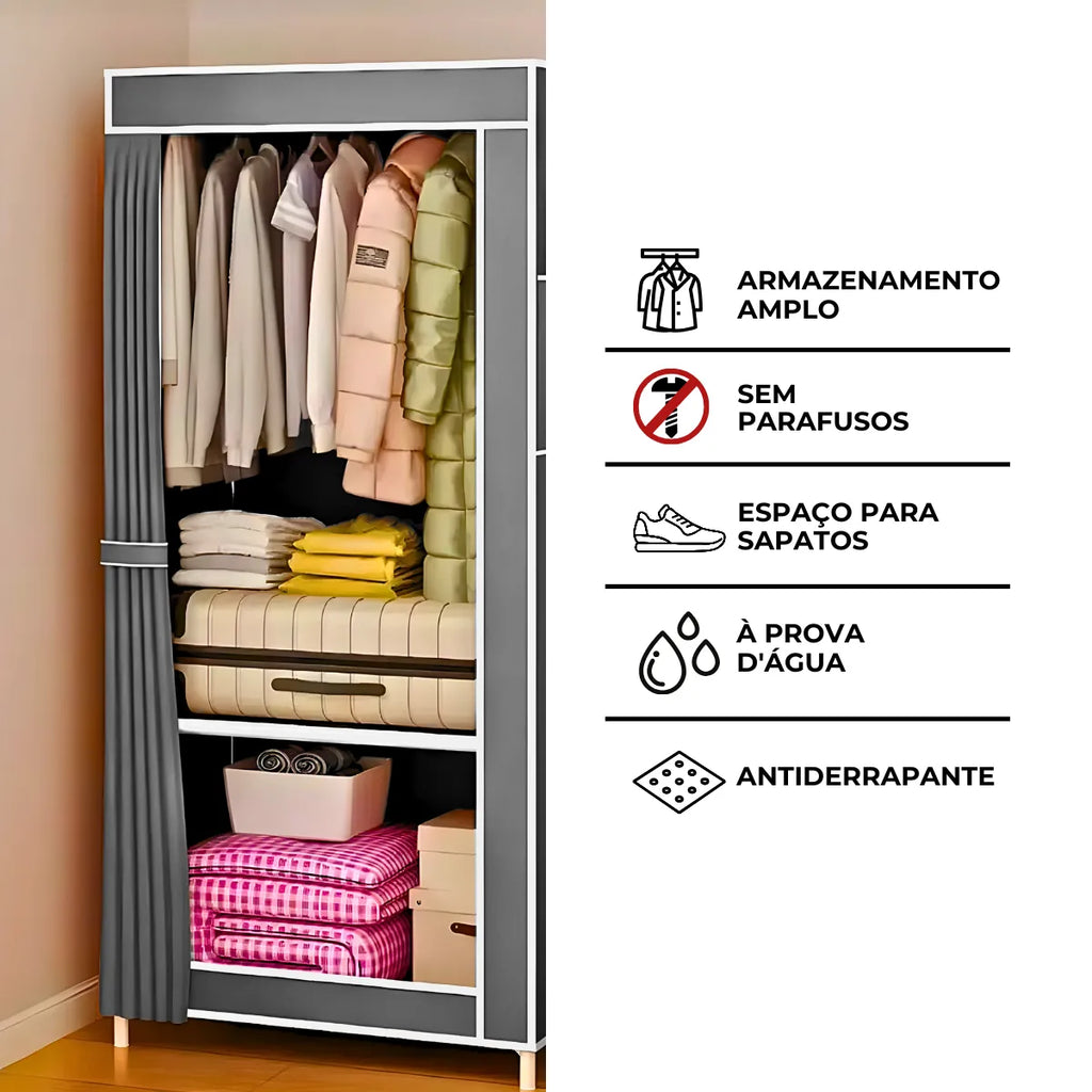 - Design que facilita a organização de roupas, calçados e acessórios.