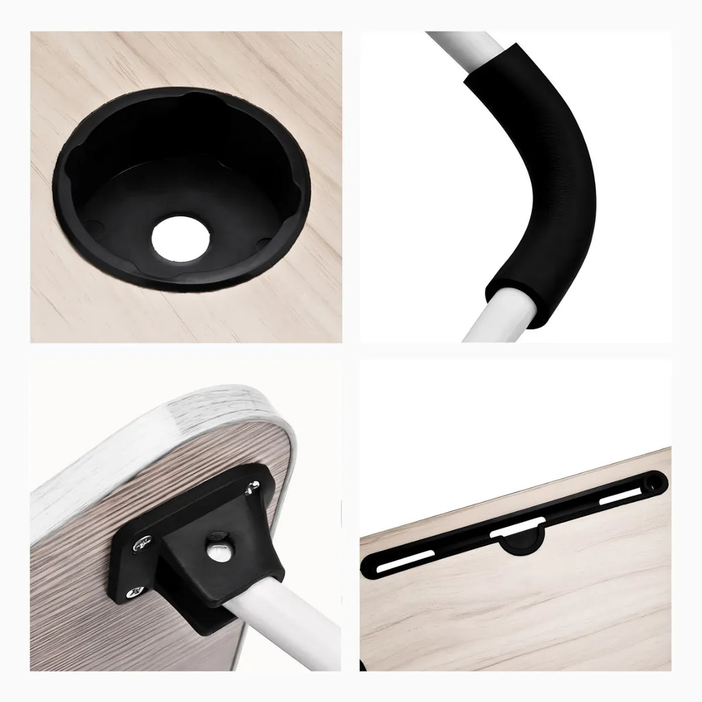 - A mesa possui um suporte para copos, garantindo que você possa desfrutar de suas bebidas enquanto trabalha ou estuda. Além disso, conta com um espaço específico para apoiar tablets e livros, proporcionando conforto e acessibilidade.