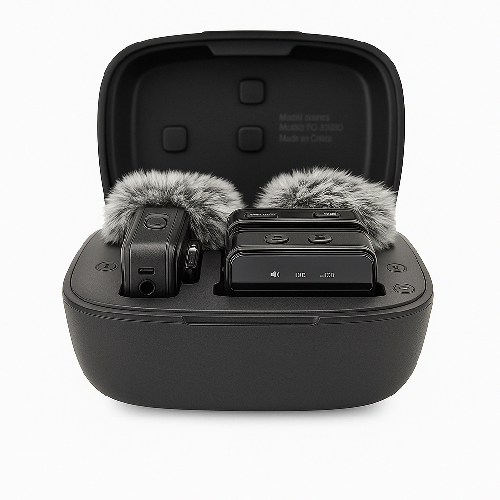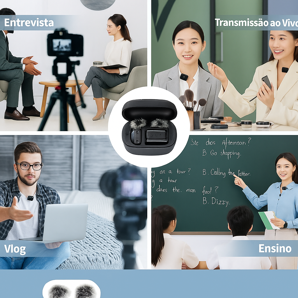 - Autonomia Prolongada: Estojo de carregamento com capacidade de 2200 mAh que oferece até 10 horas de uso contínuo após 2,5 horas de recarga. Os transmissores e receptor recarregam automaticamente quando guardados no estojo.