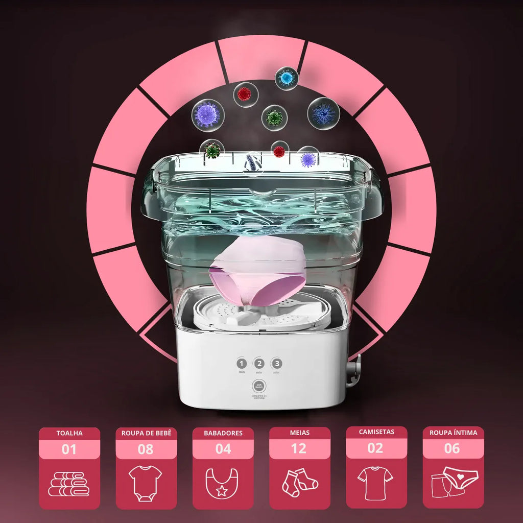 - Capacidade Surpreendente: Compacta, mas com capacidade para lavar até 1 kg de roupas. Ideal para itens íntimos e roupas de bebê, permitindo trocas diárias sem acúmulo de lavanderia.
