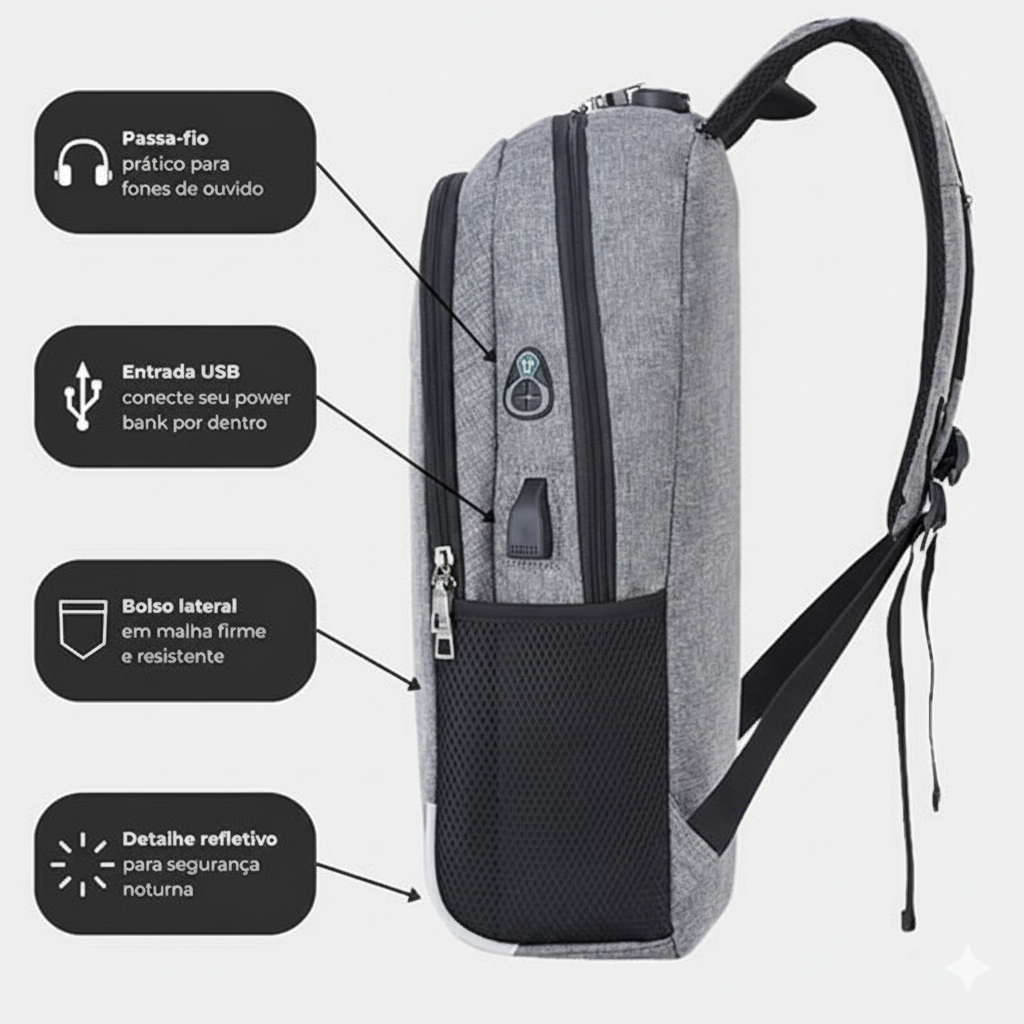 Ideal para profissionais, estudantes e viajantes que buscam uma mochila com design moderno, espaço inteligente e tecnologia integrada para o dia a dia.
