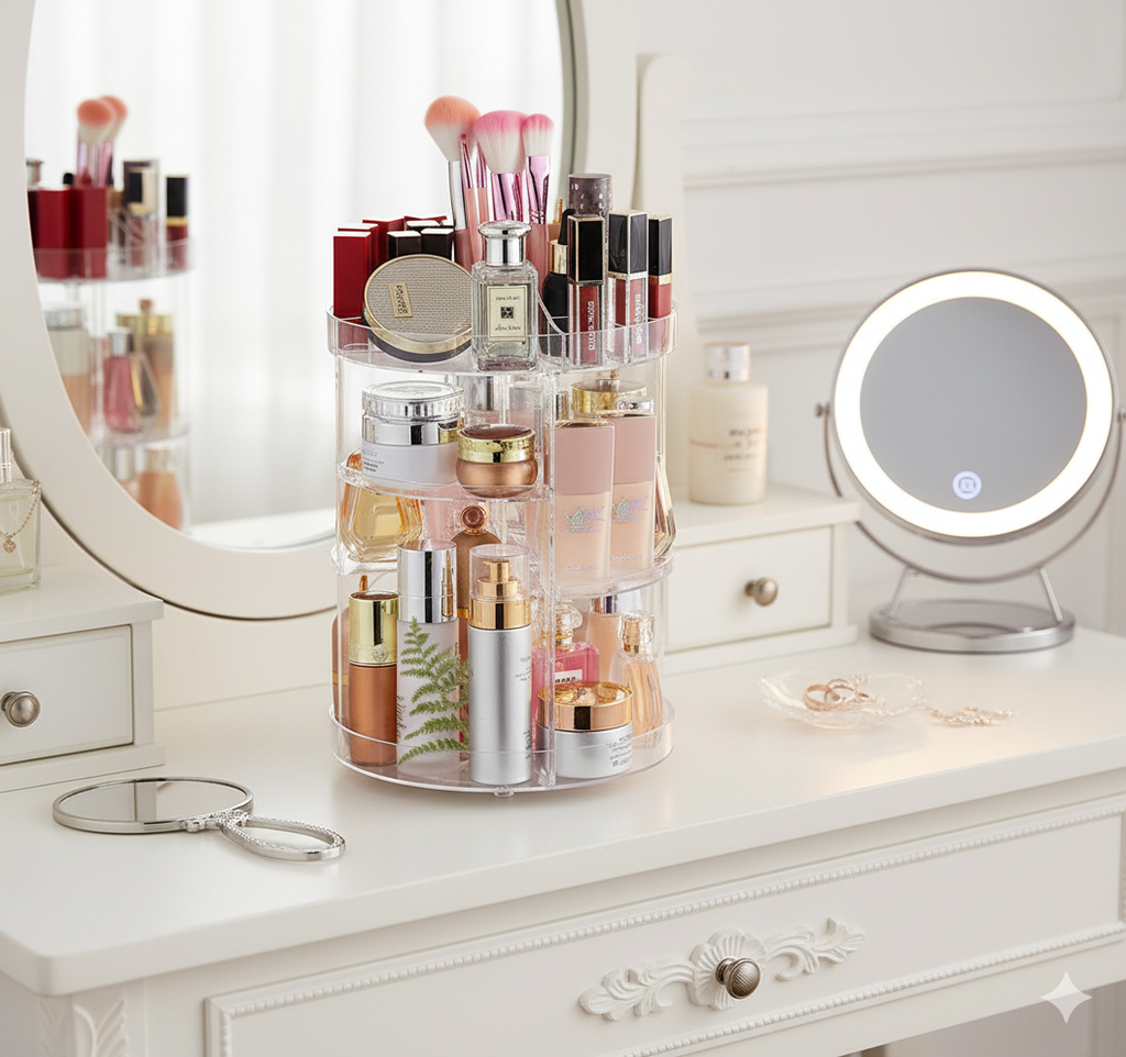 O organizador giratório de maquiagem e cosméticos em acrílico transparente é uma solução prática e elegante para manter produtos de beleza sempre ao alcance e bem organizados. Com um design funcional e moderno, ele foi desenvolvido para otimizar espaços, oferecendo alta capacidade de armazenamento e fácil acesso aos itens do dia a dia.